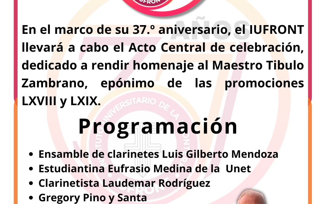 En el marco de nuestro 37.º aniversario, el IUFRONT realizará este viernes 28 de noviembre el Acto Central de celebración, un evento muy especial dedicado a rendir homenaje al Maestro Tíbulo Zambrano, epónimo de nuestras promociones LXVIII y LXIX.